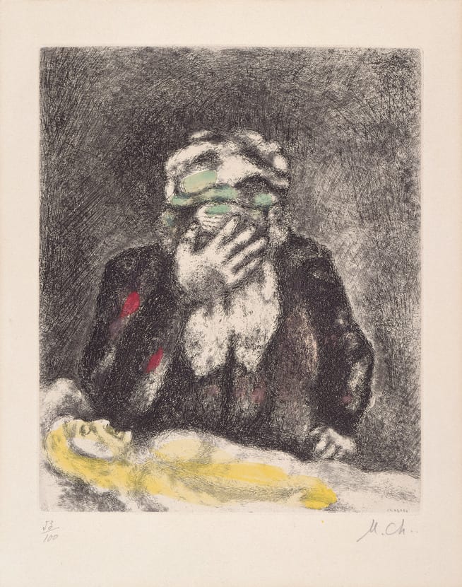 Chagall evokes Abraham's profound grief in this simple yet monumental composition. With bowed head and covered face, Abraham's bereavement is discrete and contained in his massive solidity. Sarah is laid out horizontally before him, her insubstantial body emanating an ethereal light. The weight of Abraham's loneliness is accentuated by the jagged darkness pressing down on his shoulders.