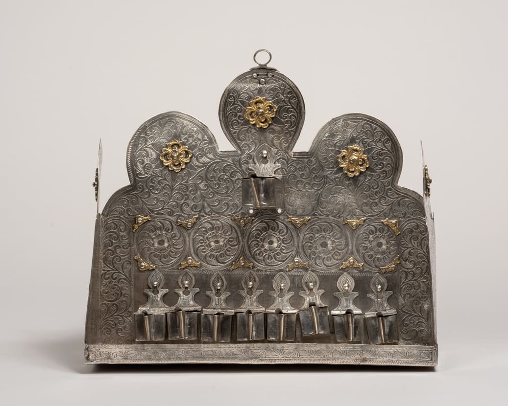 Silver lamps from North Africa are rare, and the form of and ornamentation on this piece do not appear in other Hanukkah lamps. Closely related decorative devices and motifs are, however, employed in jewelry. Gilt appliqué rosettes like those on this lamp are characteristic of bracelets, anklets, and belt buckles from Essaouira. These works date from the nineteenth century through the early years of the twentieth century, after which silversmithing in Essaouira began to decline. Another design element on this lamp consists of incised rosettes with circular centers and radiating striations on the petals. This particular form of rosette decorates jewelry from Essaouira, Marrakech, and Meknes, and dates from the nineteenth to early twentieth century.