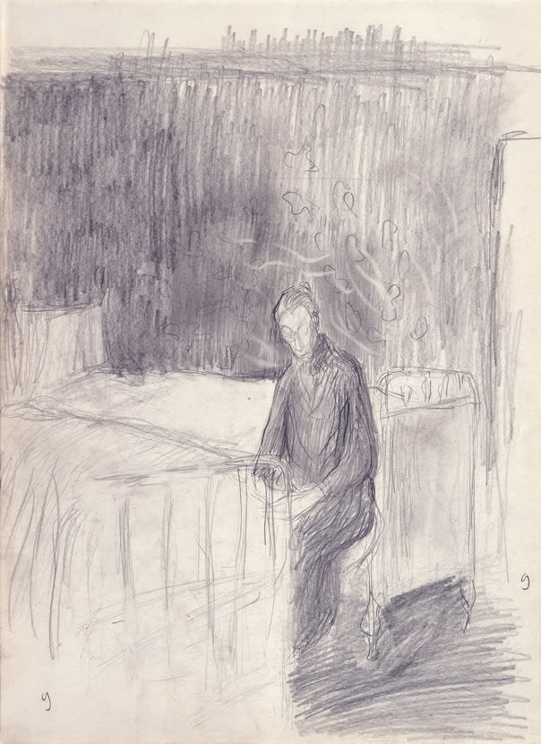 From 1941 until 1944, Gedö made numerous pencil drawings at a home for the elderly. With simple graphic markings the artist builds up an arrangement of tones, depicting an interior with a woman seated by a bed. The woman has her back to the door and seems to arrange the covers on the bed opposite her. The absence of detail conveys a sense of mystery; the suggestive sensitivity of the drawing evokes the figure's interior psychological state.