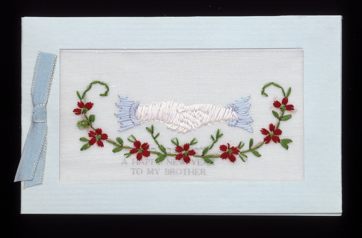 - Paper: embossed and printed with ink; gauze embroidered with cotton; satin ribbon