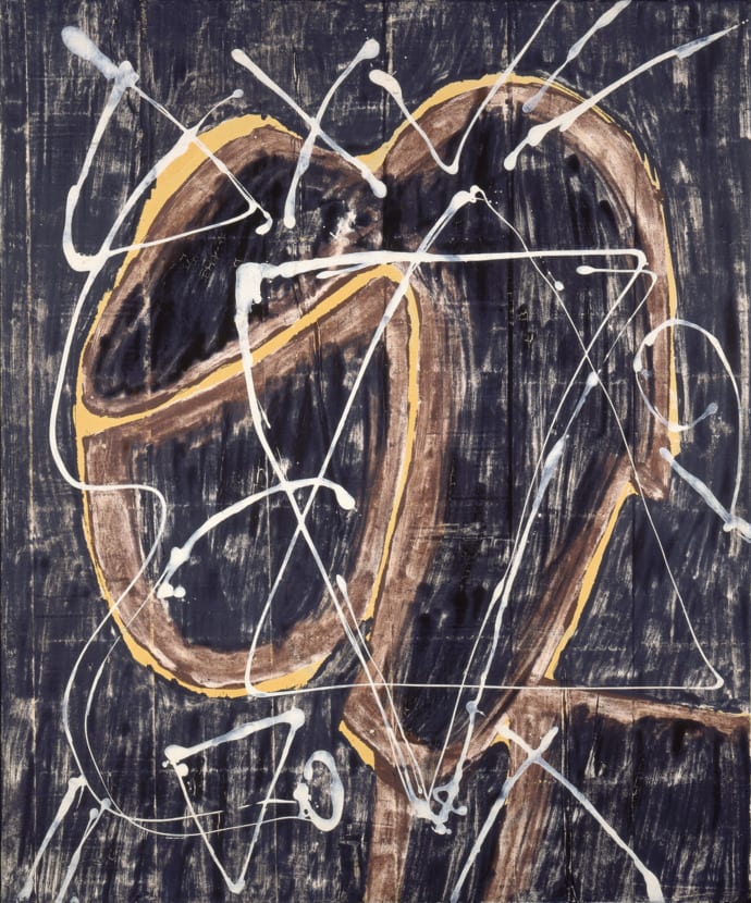The orientation of this painting has been debated, as Morris Louis was flexible on this aspect of his work. At one time, it was displayed at the museum upside down and referred to as Untitled (Jewish Star). During preparations for the present exhibition, arrows on the back were determined to have been made by the artist, and to indicate the orientation in which it is now shown. When it is hung this way, a figure emerges. The painting is now identified as Louis’s Man Reaching for a Star.