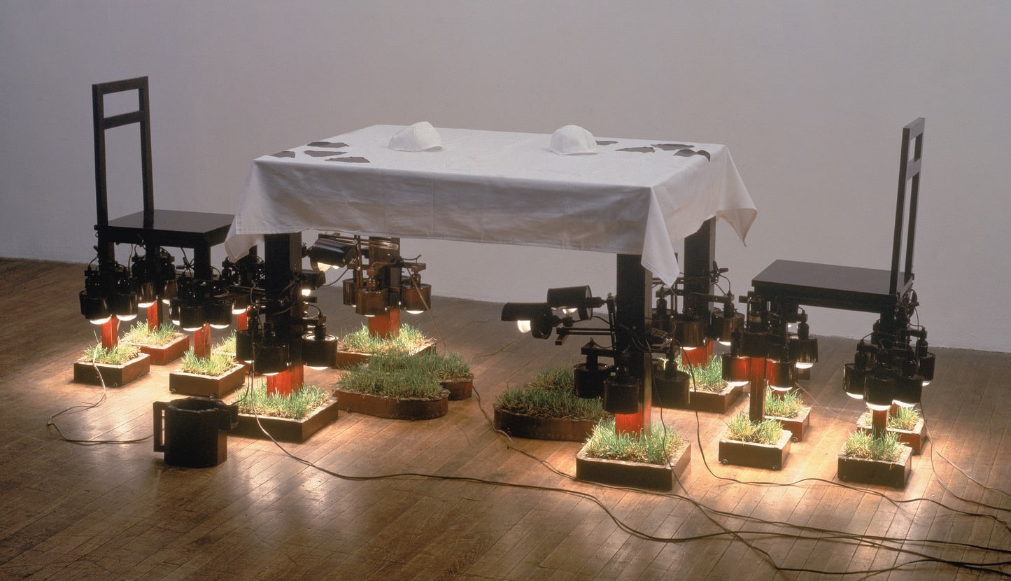 Alan Wexler thoughtfully reinvents a sukkah—a small outdoor structure that observant Jews eat in during the fall harvest holiday of Sukkot. With its table and chairs sitting in live grass, Indoor Sukkah brings the outdoors inside and underscores ancient Judaism’s agricultural origins.