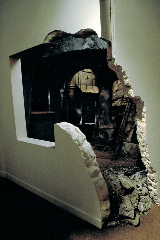 Infused with a deep sense of loss and sadness, Eleanor Antin's Vilna Nights creates an environment of a place and a time that are long lost. Commissioned by The Jewish Museum for the 1993 From the Inside Out: Eight Contemporary Artists exhibition to inaugurate the museum's new exhibition space, the mixed media installation appears as a ruined shell with a bombed-out courtyard. Through a demolished wall, the viewer can peer in on three vignettes of life-size projections onto windows.