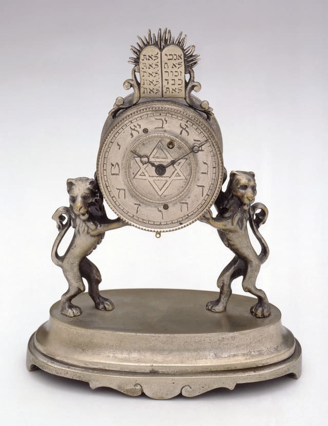 Designed to grace the mantelpiece of a prosperous bourgeois Viennese home, this clock declares its Jewish identity robustly. The dial bears a Star of David; the hours are marked with the Hebrew letters that correspond to numerals, and the whole is crowned with the Tablets of the Law. In style, the clock has the elegant, simple lines of the Biedermeier era in Vienna (1815–48), a period characterized by an embrace of family, order, and tradition.