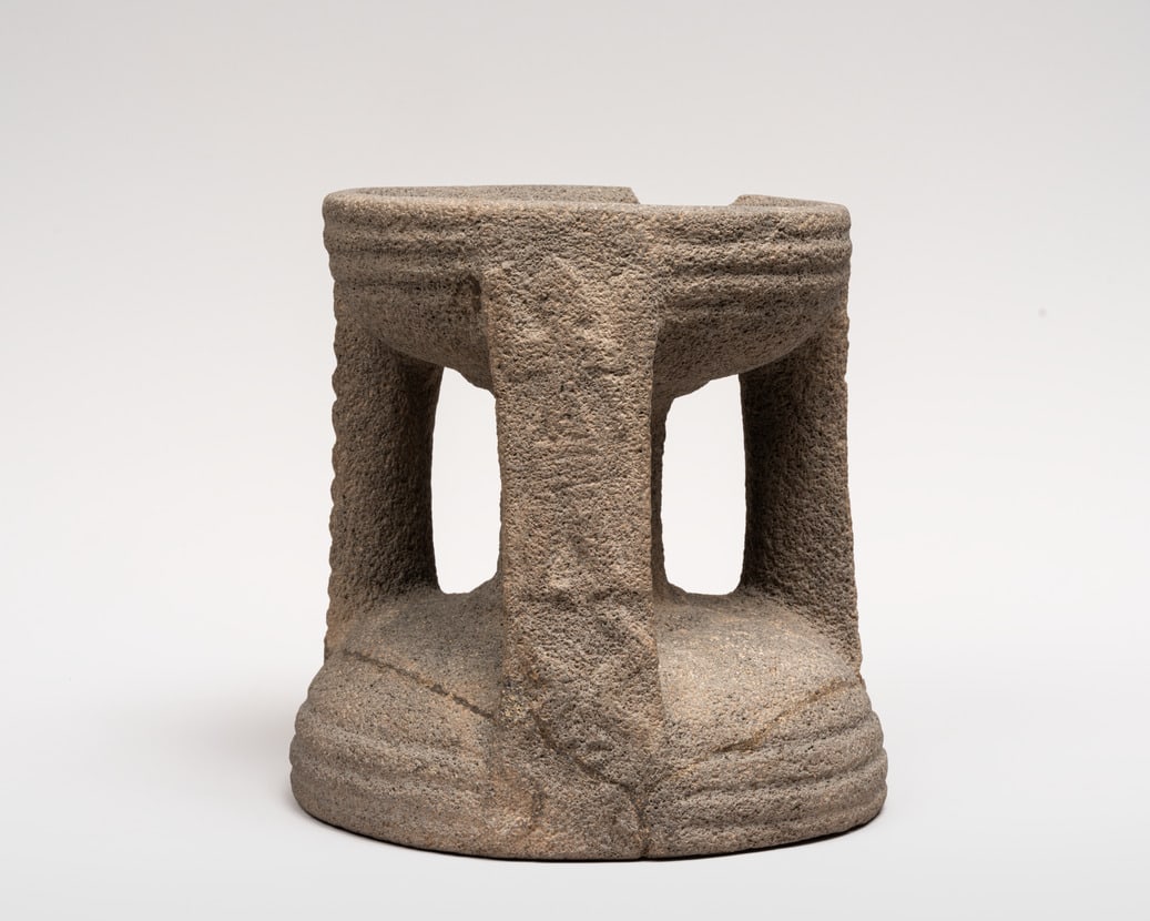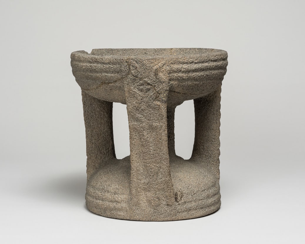 The two bowls comprising this piece were intended for the worship of two different Hittite or Syrian deities, who are depicted on panels on the vertical elements. During the worship of the sun-god, the larger bowl was used, so that the representation of the sun-god standing on a lion was right side up. When the object is turned over, the image of a deity standing on snakes, probably a weather god, appears right side up. Worshippers may have placed offerings or libations to the gods in the bowls.