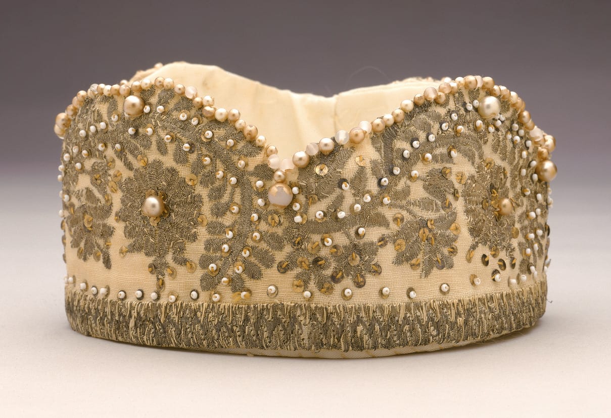 This crown was worn by the donor as part of a Purim costume of Queen Esther that also included a vest and a sash. The crown was fabricated from an older textile of hand-woven linen embroidered with gilt metallic thread, probably a hand towel, brought to America by the donor's mother when she emigrated from the Greek island of Corfu in 1913. Home to a Jewish community of long standing, Corfu attracted powers from east and west and for centuries was under the political and cultural influence of Venice.