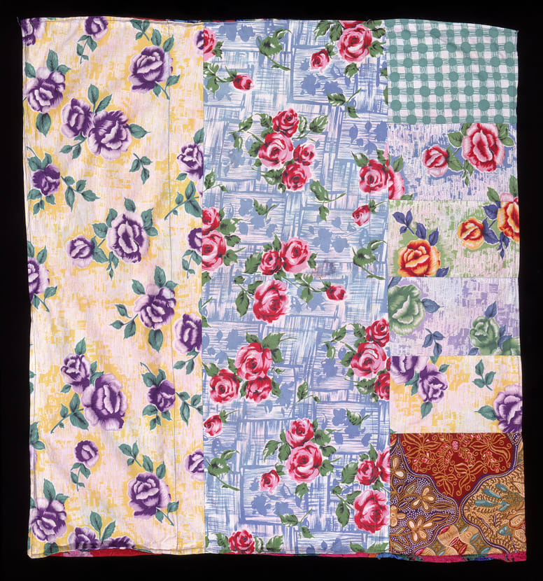 The textiles which served as hallah covers in Afghanistan were of the same type as those generally used to cover the trays on which meals were served. The large size of this hallah cover accommodated the large flat Afghani bread used as hallah. The colored floral print fabrics of the mid-late 1950s are of Russian manufacture and relate to some of the Bokharan printed scarves in our collection, as well as to the linings of costumes.