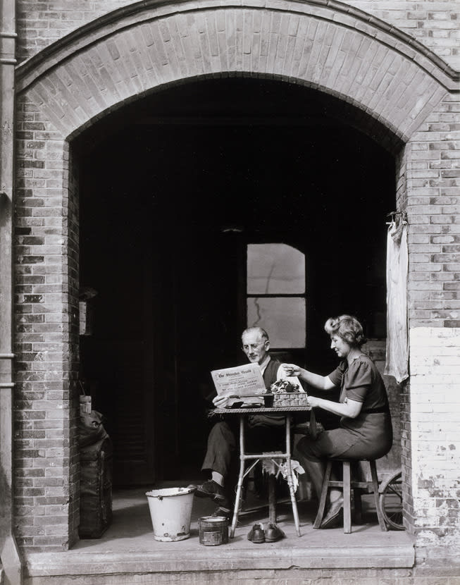Shanghai, China - April 1946. Refugee families carefully read the German language edition of the Shanghai Herald. News of proposals for repatriation is eagerly read and discussed. UNRRA Committee proposed repatriation of 1,700 Germans and 1,300 Austrians to thier homeland.