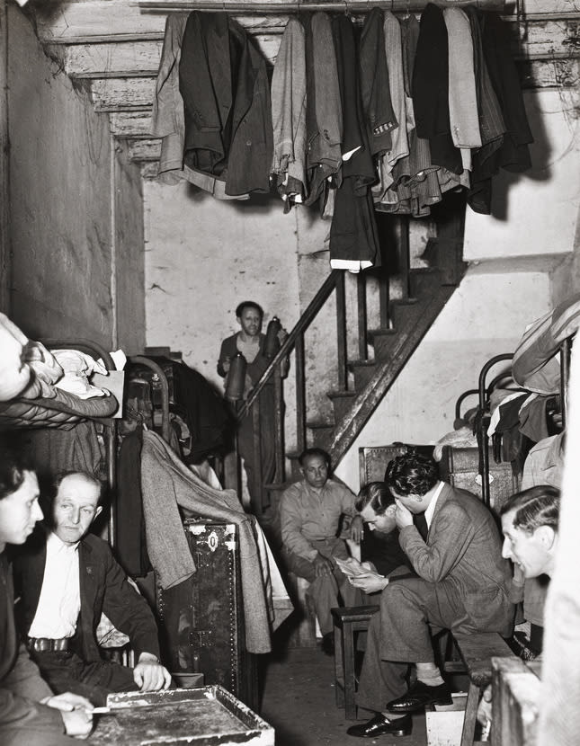 Shanghai, China - April 1946. Jammed into eight camps, German and Austrian refugees live out of steamer trunks. Clothing is hung from the ceiling to save space. UNRRA has erected Quonset huts to alleviate the housing shortage.