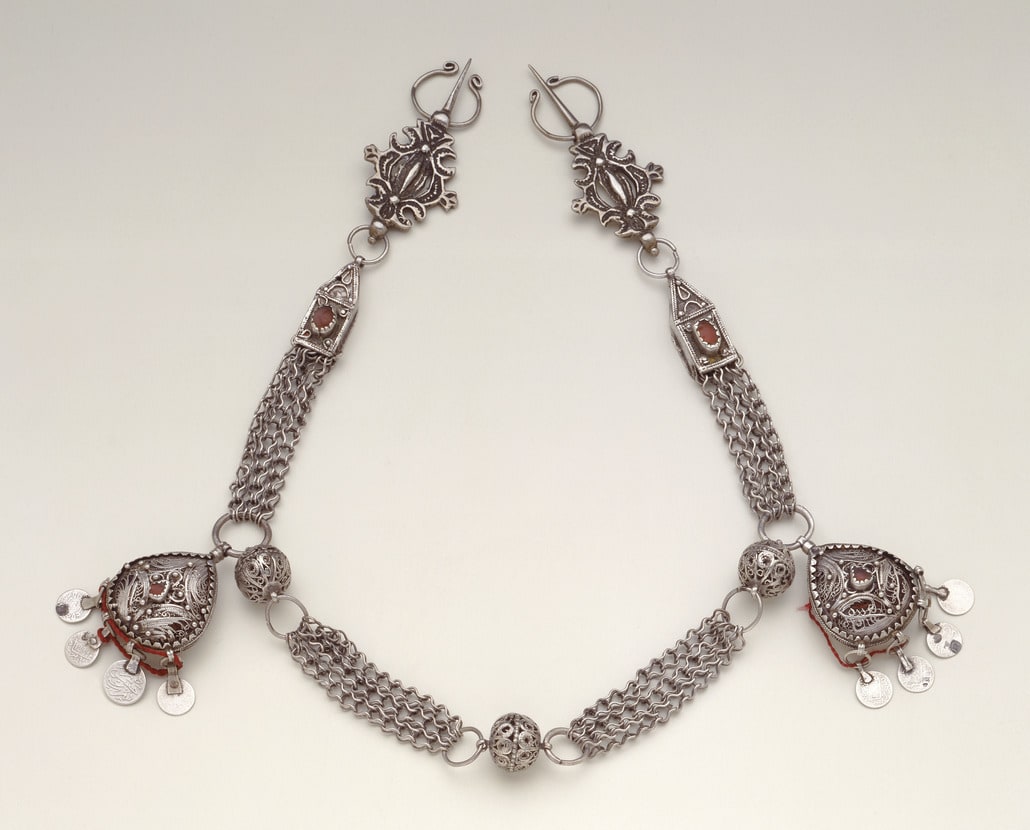 - Silver: cast, filigree, granulation, and engraved; carnelian; leather