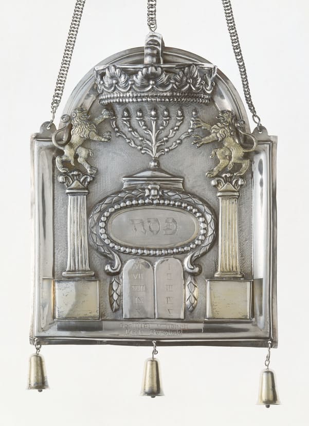 A plain molding outlines the shape of this shield, a rectangle with arcuated top. Within are two fluted pilasters set off from the background on tall pedestals, which support rampant lions turned towards the center field. Along the axis of the shield, the following elements are arranged contiguous to one another (from bottom to top): the Tablets of the Law (inscribed with the Roman numerals I-X); oval holy day plaques surrounded by a beaded frame and a wreath which extends downward to embrace the Tablets; a menorah with flowering branches; and a crown which projects from the surface to enclose a bell. A bossed semi-circular band connects the center of the crown to the top of the arcade. The following German inscription is engraved on the lower border: "Gestiftet v. Herrn Erich Berghold."("Donated by Erich Berghold".) The Berghold family were prominent mortgage bankers in Danzig.