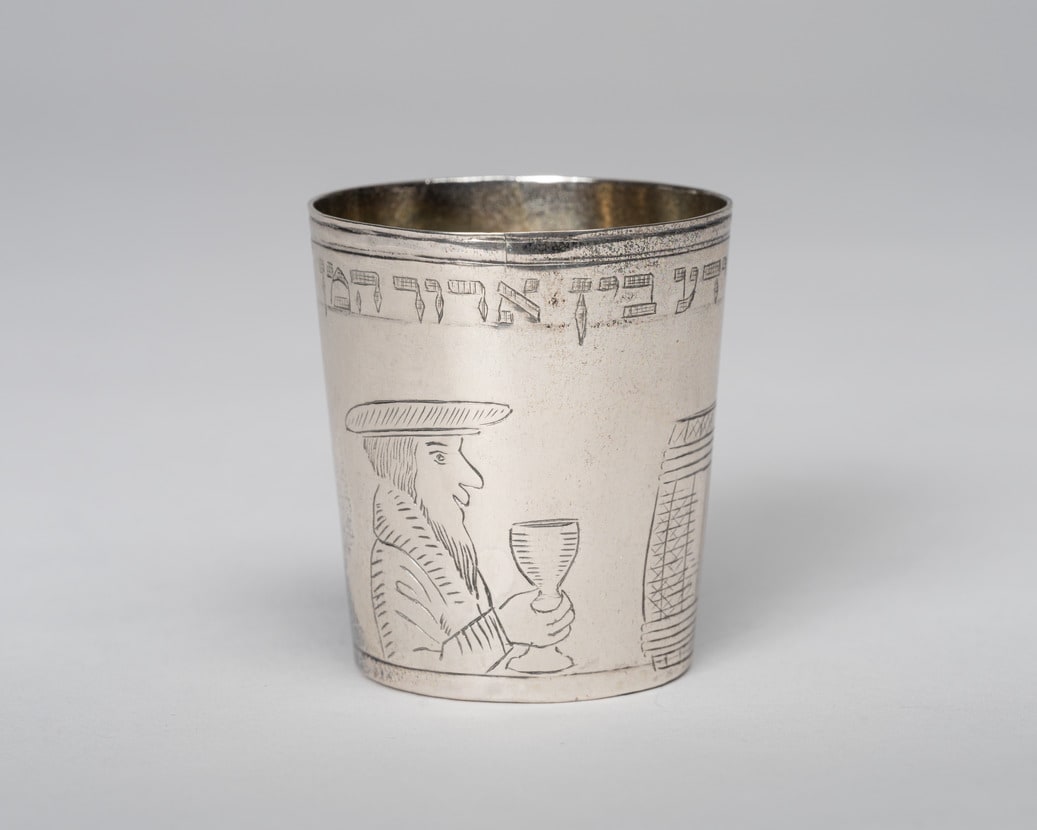 The rabbis of the Talmud suggested that Jews should celebrate Purim by drinking until they no longer knew the difference between blessing Mordecai, the Jewish hero of the Purim story, and cursing Haman, the evil vizier. This saying is inscribed around the rim (Talmud, Megillah 7b) and is illustrated by the figure of a man raising a cup. The second figure represents another way Purim is celebrated, through the performance of comic plays, "Purimspieln."