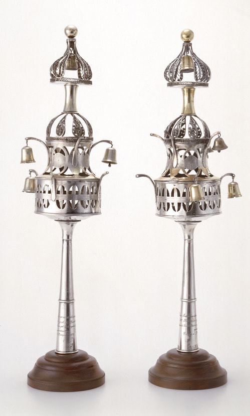 Although made in the begining of the nineteenth century, these Torah finials were dedicated in 1893 by members of the Italiener family of Danzig in memory of their parents.