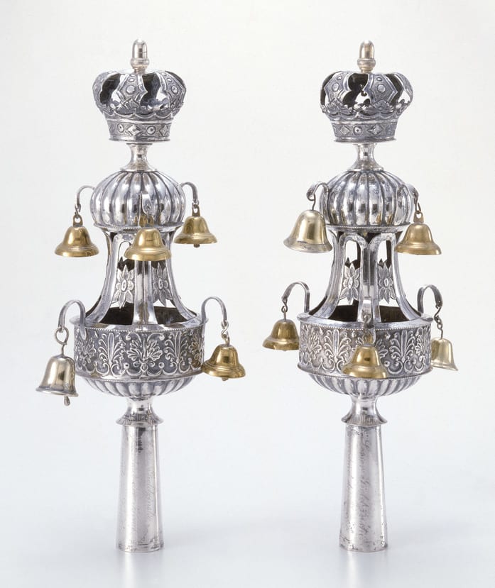 The German inscription on these finials indicates they were donated by Lesser Gieldzinski to the Danzig Jewish Community. Gieldzinski was a wealthy merchant and art collector who gave his entire collection of Jewish ceremonial art to the Great Danzig Synagogue in 1904. This constituted one of the earliest known Jewish museums.