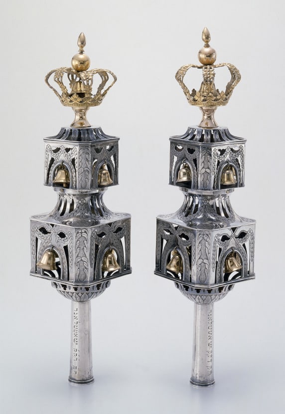 The two-storey-tower forms of these rimmonim rise from plain shafts each of which terminates in an echinus whose bottom is covered with leaves and whose upper section is pierced by cut-out forms. Both stages of the graduated towers are cubic with beveled edges. Each face is decorated with swags of leaves and cut-outs which surround an open arch in which hangs a pendant, parcel-gilt bell. A spool-shaped intermediate zone decorated with similar motifs connects the two stages. Parcel-gilt openwork crowns surmounted by double finials top the towers. Each shaft is engraved ("B[urial] S[ociety] o[f the] h[oly] c[ongregation of] Schottland.")