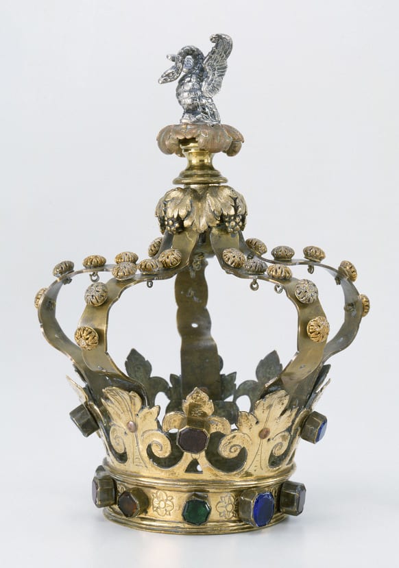 - Copper alloy and silver: cast, chased, and parcel-gilt; glass