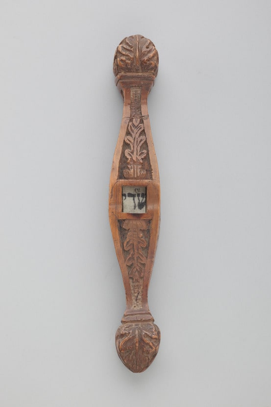 - Fruitwood: carved; ink on parchment; glass