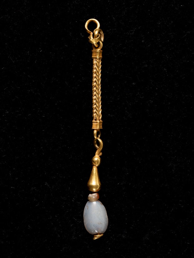 - Gold: hammered, braided, granulated; opal (?) and pearl: drilled.