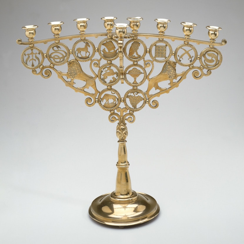 Combining elements of early-twentieth-century design with Jewish imagery, this lamp depicts the emblems of the Twelve Tribes of Israel. These are taken from Genesis 49, in which the patriarch Jacob/Israel blessed his twelve sons, comparing each to an animal or object that represented their character. For example, Judah was likened to a mighty lion, Issachar was an ass giving tribute to others, while Dan was the serpent who stung the Israelites into righteousness. The lotus flower at the top of the shaft and the graceful curve of the crossbar reflect the stylistic trends of Jugendstil, while the use of medallions are derived from Zadikow's early interest in medals. Only one other Hanukkah lamp is known to have been designed by Zadikow, a wooden one made in the concentration camp Theresienstadt, a year before his death in 1943.