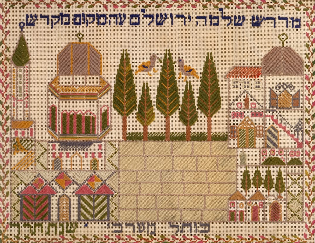 The contents of the scene are indicated by Hebrew headings: above: Solomon's Temple (site of el-Aqsa Mosque); Jerusalem w[ith] the Temple Mount; below: the Western Wall, the year [5] 604 (=1843/4). The forms are rendered with a colorful palette. The Dome of the Rock is shown as a domed polygonal building with a roof finial, a feature appearing on Al-Aqsa and the minaret at far left. The trees are sycamores which became symbols of the Temple mount. An unusual detail are the pair of birds flanking the central sycamore.