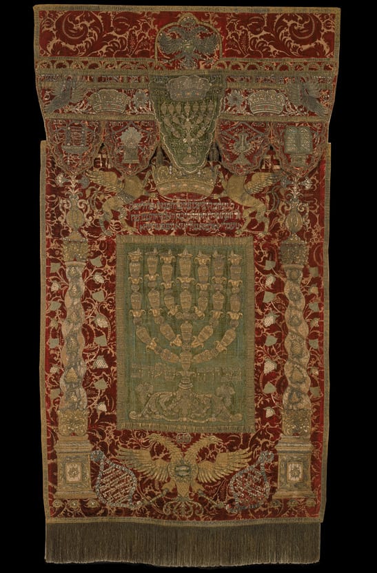 Indeed, this curtain and valance represent a late flowering of a type that had been established in Bavaria in the 1720s by another Jewish embroiderer, who signed his works "Elkone of Naumberg." The valance of a curtain made by Elkone for a synagogue near Augsburg (as is Pfersee) also bears three crowns (symbolic of Torah, priesthood, and royalty) and five vessels of the ancient Tabernacle, arranged in the same order and similar in form to those on Jacob Koppel Gans's work. Elkone may have been inspired by a series of valances with Tabernacle vessels made in Prague and Frankfurt during the second decade of the eighteenth century. His work, in turn, served as a model for that of Jacob Koppel Gans. It was Gans's original achievement to have closely integrated the decoration of the valance with that of the curtain by repreating the same symbols on both: the menorah, the crown, and the heraldic double-headed eagle.