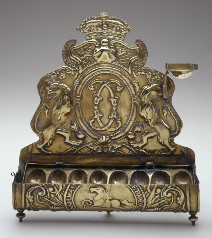 This lamp was made from the ornamental metal plate affixed to the front of a grenadier's helmet, which had a tall conical shape. Grenadiers were trained to throw grenades during combat, and the helmet shield is, in fact, ornamented with flaming grenades, now on the sides of the lamp. Other Hanukkah lamps made of converted helmet plates are known from the Netherlands, Germany, and Austria and date to the eighteenth century. Quite a few were inscribed with the initials of either Frederick II of Prussia or Maria Theresa of Austria, whose countries were engaged in a conflict that culminated in the Seven Years' War of 1756-63.