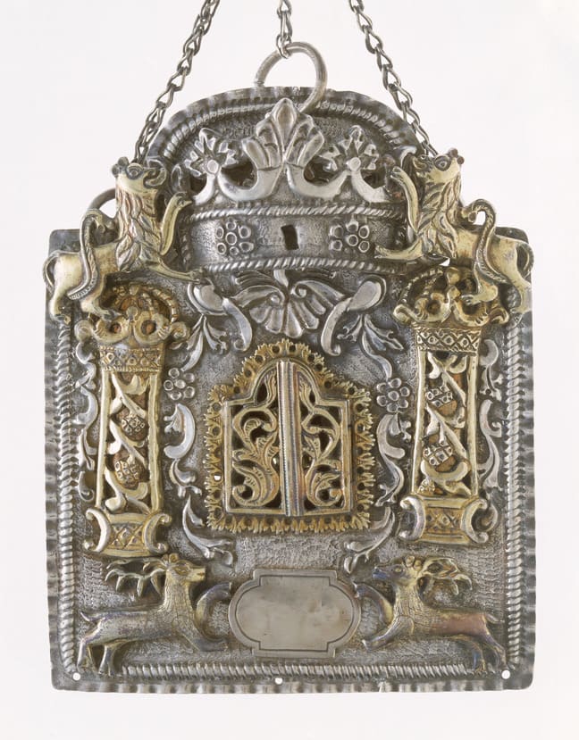 The composition of this shield, with its ornamented columns topped by lions, Torah ark door flanked by garlands and lower cartouche flanked by animals, is similar to shields created in Lublin, Poland.