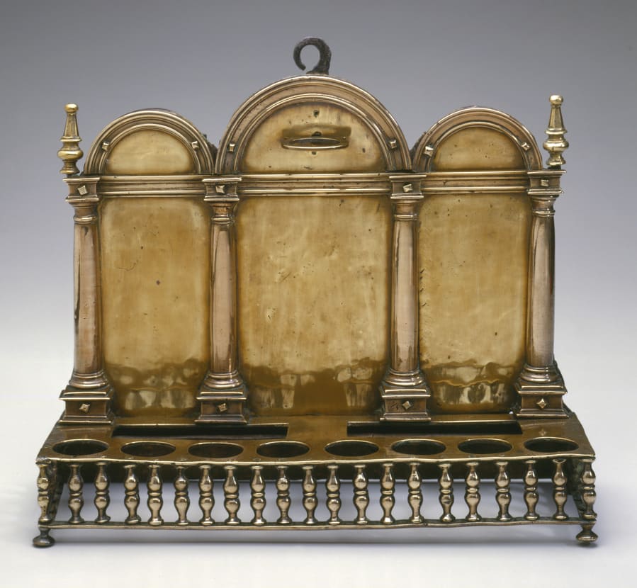 The inspiration for the use of this architectural form on a Hanukkah lamp could possibly have been the Renaissance tabernacle frame. These wooden frames, consisting of a round arch supported by elaborate columns, were designed to hold religious images for private devotion, particularly in the fifteenth century. Instead of icons, the arches on the earliest versions of wall-hung Hanukkah lamps have only plain reflective sheets of metal.