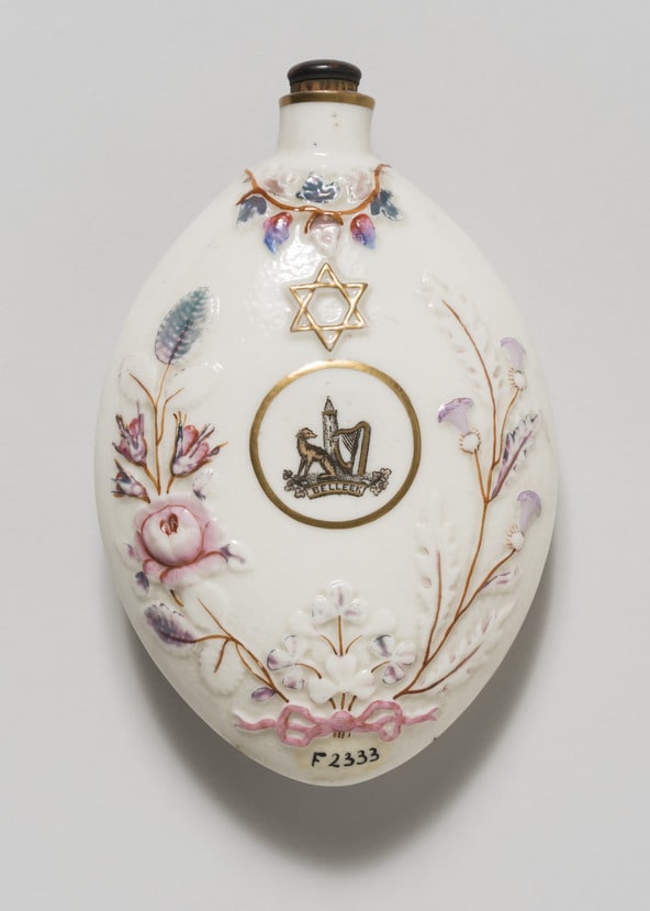 When this puzzling flask was acquired by the Jewish Museum in 1948 the six-pointed star was presumed to be Jewish. However, it may be Masonic. The flask was made by Belleek, Ireland’s renowned porcelain manufacturer. The company’s art director at the time, Robert Williams Armstrong, was a Freemason who designed dinnerware for Masonic lodges.