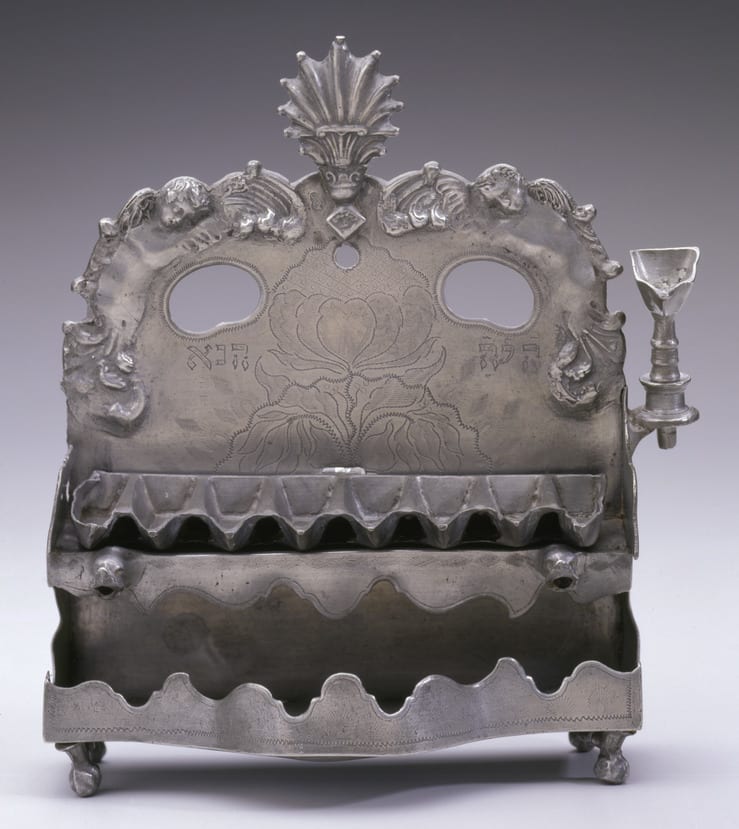 This lamp type with two angels curving around the backplate is one of the only pewter groups that has cast relief decoration. Two dolphin-head spouts act as gargoyles to funnel off any precious oil and collect it in a miniature pail that would have hung from their mouths. The Hebrew initials engraved on the lamp most likely represent the names of the owners, probably a married couple. The custom of marking secular and ritual pewter in this way began as early as the sixteenth century, when pewter was such a highly desirable commodity that it was often stolen and sold back to the pewtersmith to melt down for raw material. These initials were engraved either by the pewterer or the owner.