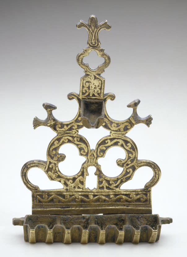 This lamp belongs to a cast group made in the Atlas Mountains whose surface is ornamented with vinework executed in thick raised lines. The enamel that fills the voids left by the raised decoration is a rare survival on Moroccan Hanukkah lamps; it is typical of work in the Central Anti-Atlas Mountains, found, for example, on rifles and daggers of the nineteenth century.
