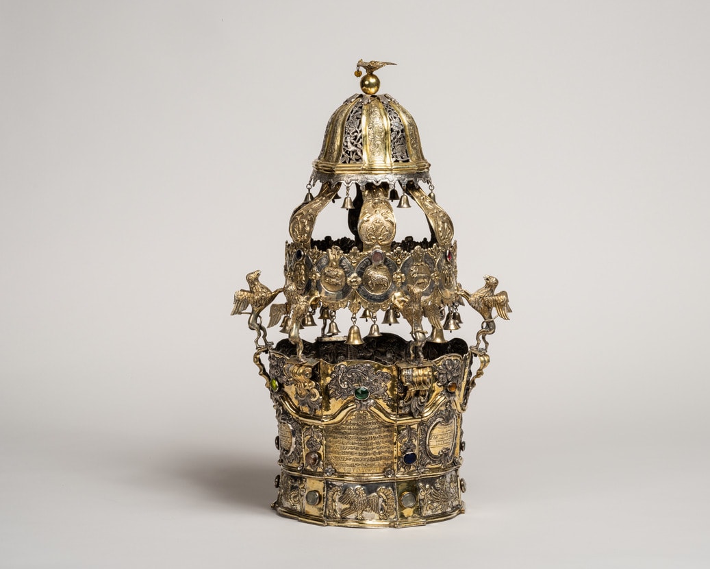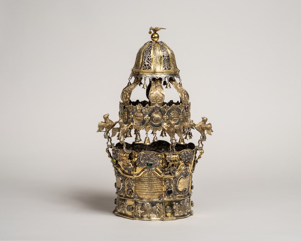 By adding another tier and a dome, the second, unnamed donor created a crown whose complex structure reflects the multitiered architecture and furnishings of Galician synagogues of the seventeenth and eighteenth centuries. He also set a pattern that would be followed by numerous Eastern and Central European Torah crowns into the twentieth century.
