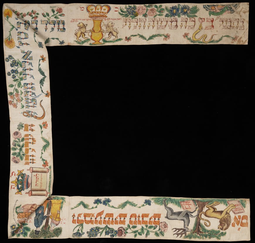 This richly decorated binder was made to honor Nehemiah, son of Moses Halevi, who was born under the sign of Virgo, represented here by a woman seated under a tree. The boy was a Levite, a descendant of the tribe of Levi responsible for ritual cleanliness in the ancient Temple; a related illustration appears: a pair of lions flanking a large ewer inside a basin. The accompanying Hebrew inscriptions refer to the Levites’ duties, limited today to washing of the hands of the Kohanim (descendants of Aaron, the High Priest) before the latter deliver the priestly blessing at the synagogue.