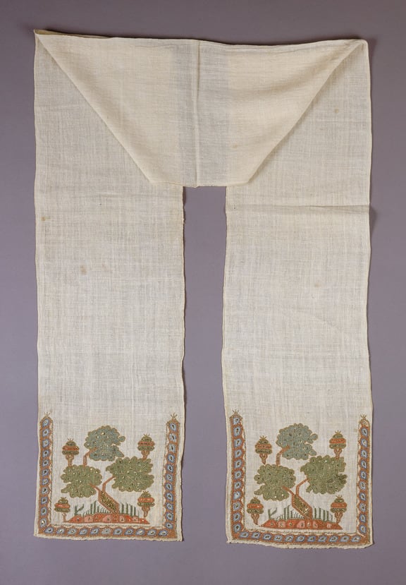 Sashes like this one were commonly decorated only at the ends, the portion visible from the front of the body. The unified motif of a single tree and the openness of the form are similar in character to the corner decorations of a 19th century kerchief in the Victoria & Albert Museum.