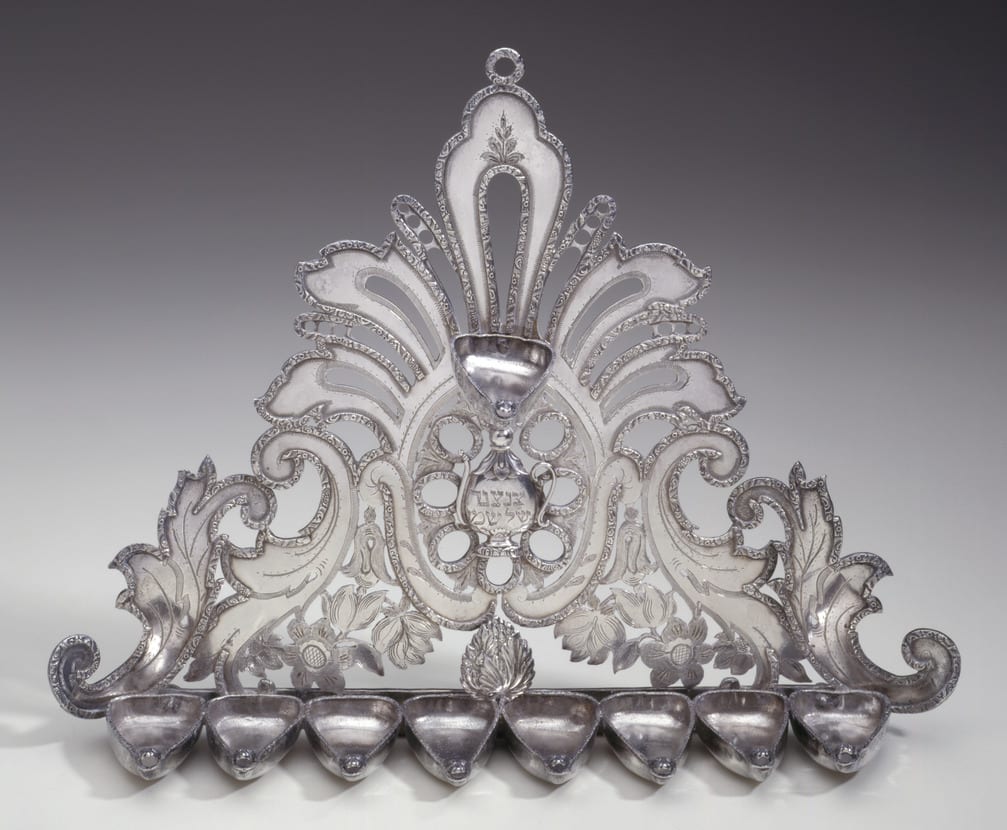 This unusual lamp combines features of two cultures and regions. The fan-like element on top, the scrollwork, and the bellflowers are typical of European decorative art of the mid-eighteenth to early nineteenth century. The rolled band decoration that has been applied to the edges of the backplate and oil containers was invented in Europe in the late eighteenth century and became quite common in the nineteenth century. In the center is a pitcher of an Islamic shape. This conflation of European and Islamic style could have occurred in Ottoman Turkey or its European domains. European-style rococo decoration is seen on a number of Ottoman objects, thus testifying to stylistic crossovers between the Ottoman Empire and Europe.