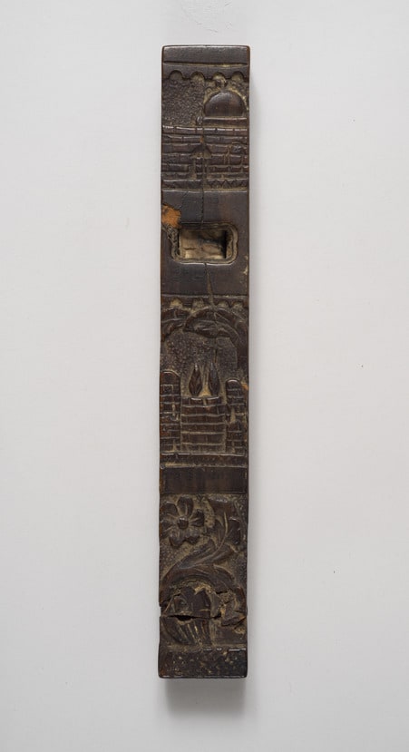 - Wood: carved; Ink on parchment