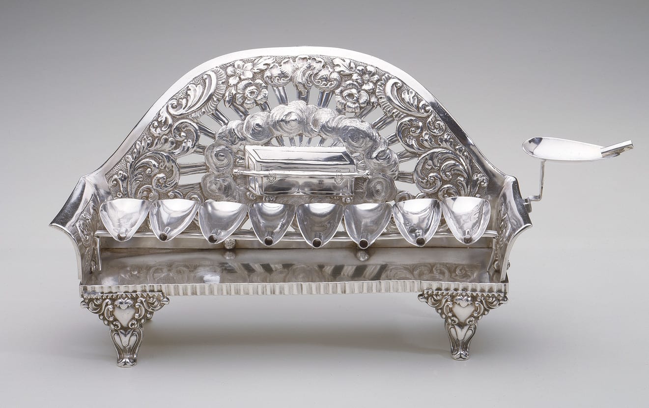 The motif on the back of this lamp, the Ark of the Covenant surrounded by clouds, is an unusual one for a Hanukkah lamp. The Ark contained the Ten Commandments and was housed in the Holy of Holies of the ancient Temple in Jerusalem. Its use here could refer to the rededication of the Temple that is celebrated at Hanukkah. However, by the time that the events of the Hanukkah story took place, the Ark of the Covenant had been missing for hundreds of years.
