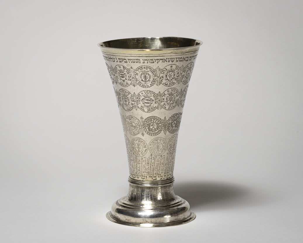 A burial society (hevra kaddisha) prepares the deceased for burial, sparing the family from this and other difficult tasks. Special beakers were often used by these societies at their banquets. Here, each medallion contains the name of a member of the Starkenburg Burial Society and his zodiac sign. Those who were Levites—from the Hebrew tribe of Levi, traditionally tasked with assisting the priests in the Temple of Jerusalem—opted instead for their traditional ewer symbol. The beaker was in use for many years, so every available space at the bottom has been filled with the names of new members.