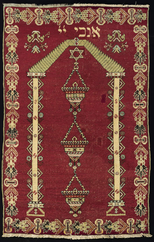 Used to cover the desk on which the Torah is read during the service, this rug shares many elements with the Muslim prayer rugs from which they were probably adapted. The central portal symbolizes the gate to Paradise in both religions. The lamps on prayer rugs may embody the light of Allah, while in a Jewish context they probably represent the eternal light that is hung in the synagogue before the Torah ark. Rabbinical texts from fourteenth-century Spain indicate that congregants there hung Muslim prayer rugs in synagogues, despite their being forbidden.