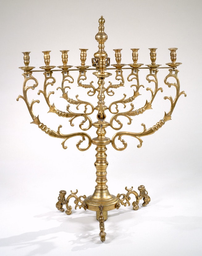 The ornate scrolls, flowers, and lion feet on this lamp are characteristic of eastern European synagogue lamps and argue for an origin in that region. This example has beautifully designed arms with three-dimensional flowers that are part of the casting and were more difficult to execute than the attached flowers of many eastern European synagogue menorot. The copper alloy has been gilded, a method of surface treatment called ormolu. This was commonly employed in Europe and the United States from the seventeenth to mid-nineteenth century in order to prevent tarnish.