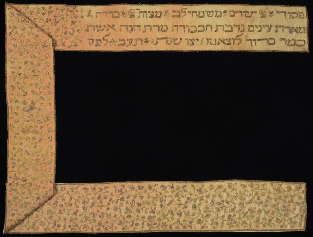 Italian Jewish women often made and dedicated their own Torah binders. The Hebrew inscription here reads: “The precepts of the Lord are right, rejoicing the heart; the commandment of the Lord is pure, enlightening the eyes,” from Psalm 19:9, followed by “Donation of the honorable Hannah, wife of Barukh Luzzato [may he be p[rotected] a[nd preserved], year [5]472 [=1711–12].”