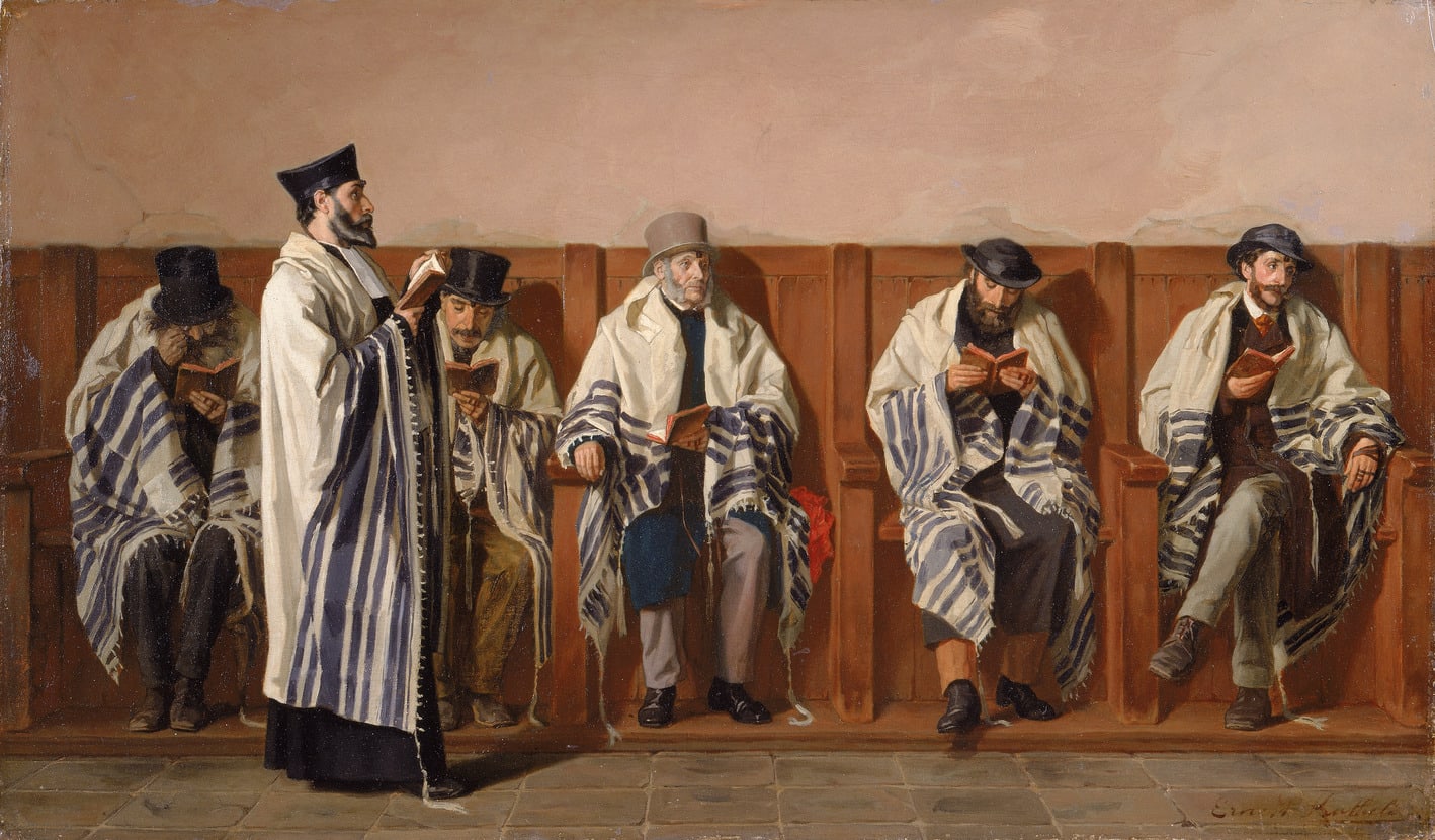Kathelin focuses on the morning weekday prayers in an affluent congregation. The artist's decision to pick an arbitrary segment of the participants and the directness of his portrayal of them is typical of 19th century realism.