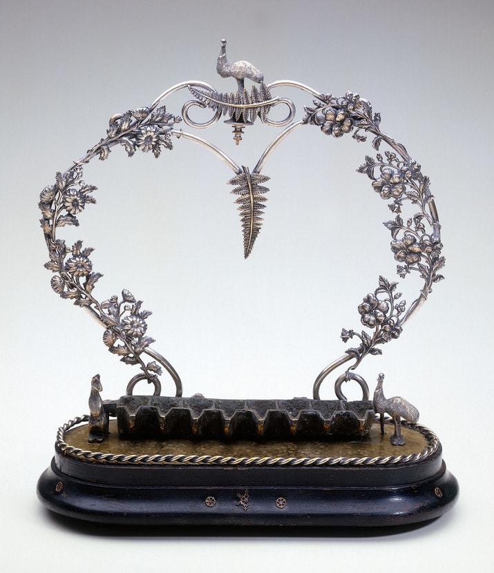 This object, minus the row of Hanukkah lights, was originally a souvenir from Australia. Its decoration consists of emus and kangaroos, as well as the leaves of the Australian tree fern, all symbolic of the Land Down Under. These elements are also seen on other mementos from there, such as an inkstand made in Melbourne to thank an Englishman for his generous support of projects in Australia.
