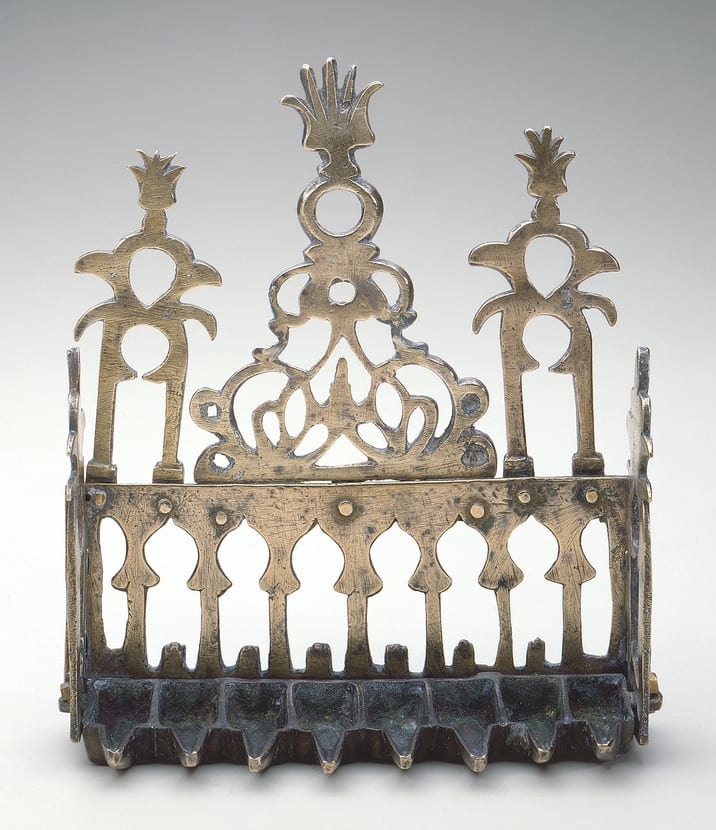 This is an example of the coastal type of North African lamp, with its smooth, undecorated surface and essentially horizontal orientation. The backplate design consists of a rectangular plaque with an openwork colonnade of arches; the scrollwork and rickety towers above the colonnade are separate and attached by rivets. All the elements on this lamp are of Islamic inspiration, from the types of arches to the prominent hamsas, or raised hands, which are believed to have protective powers in both Jewish and Muslim culture.
