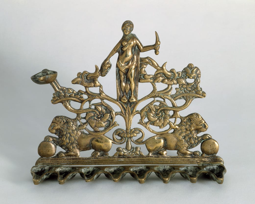 A date for this particular example can be based on that of a hybrid lamp in the collection whose lower half was cast from a related model. Instead of Judith, that lamp has two lions flanking a menorah, identical examples of which are found on eastern European lamps of nineteenth-century date.