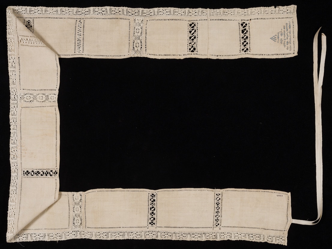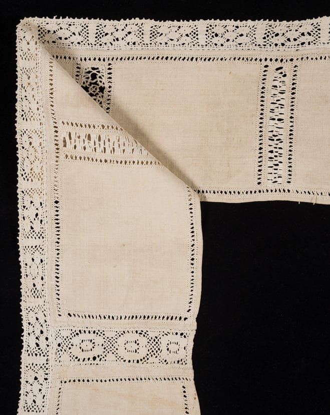- Linen: embroidered with cotton thread; cut and drawn thread work