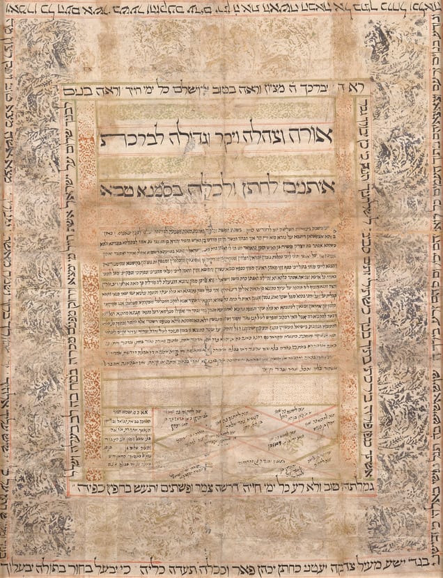 Marriage is one of the most important mitzvot, or commandments, in Judaism, and scriptures are replete with verses encouraging the union of man and woman. One of the essential elements of a Jewish wedding ceremony is the writing and transfer of a marriage contract, or ketubbah (plural, ketubbot). Originally formulated to protect a woman’s rights in marriage, the ketubbah establishes the financial obligations of the groom toward his bride in case of divorce or death. Since the contract was to be a practical document understood by all parties, it was written in Aramaic, the lingua franca of the ancient world. Only the date was written in Hebrew. Although Aramaic has fallen into disuse, it continues to be the language of traditional ketubbot to this day. Most ketubbot are based on a traditional text; however, the terms of engagement and the decoration of the contract offer a glimpse into the lives of various communities as well as the socioeconomic status of particular families.