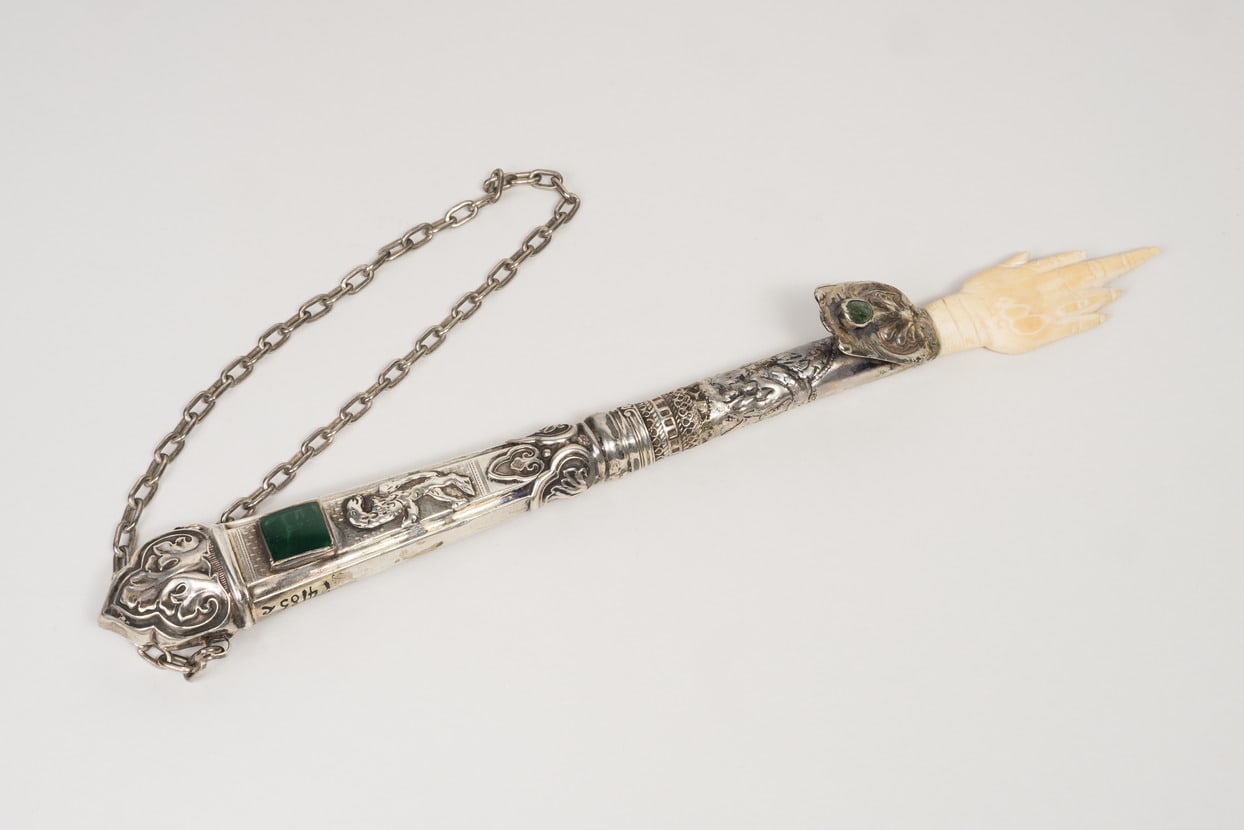 - Silver: die-stamped, chased; ivory (?): carved; semiprecious stones