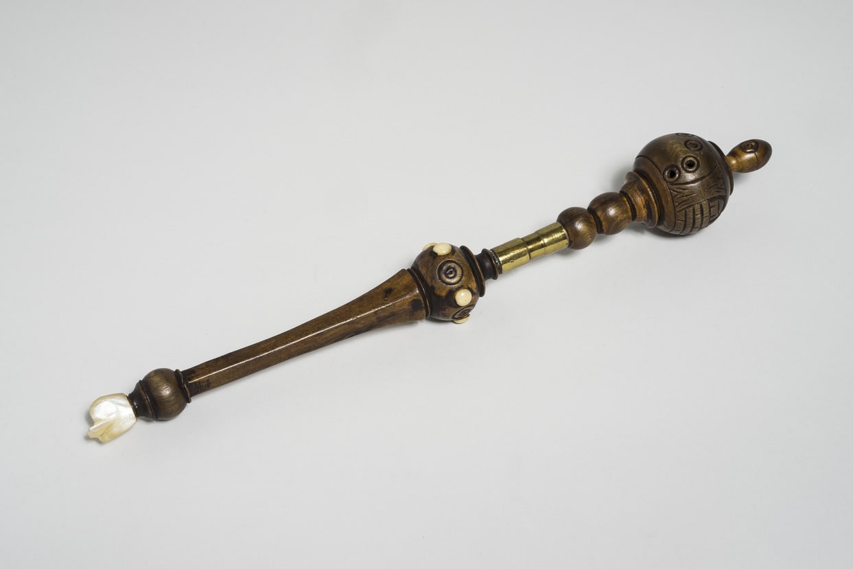 - Wood: turned, carved, pierced; bone inlay; carved mother-of-pearl; brass and iron repairs; cord