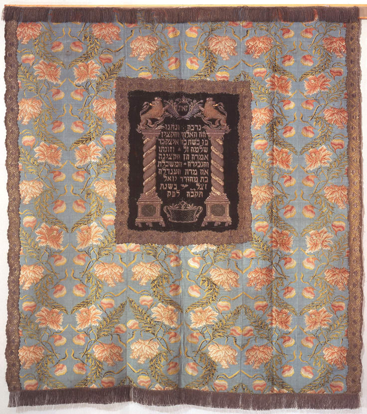 Unlike Torah textiles that were pieced together from precious scraps of fabric, this curtain is constructed from a length of silk measuring more than five yards used in its entirety from selvedge to selvedge. The small central panel does not overwhelm the decorative repeat of the surrounding silk, the primary decorative focus of this curtain. The inscription giving the donors names and the date is accompanied by traditional motifs, flanking lions atop twisted columns.